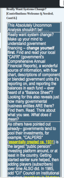 Heard of “disruptive technologies?” Disruptive innovations? Despite the blog’s appearance, I know what I’m doing! You’re looking at long-term leverage, in the hands of the “non-experts,” in the public interest, not public funded propaganda to drive business to private pockets. Hence, I’m not afraid to ask: The formula wasn’t complex, but the concept itself was just so devious insidious, parasitic, grandiose, and by now, so baked into the economic, institutional infrastructure, people either don’t notice, or, in a common, cowardly, but all too human response they see, and just start denying, or looking for nicer explanations of an ugly truth — where it’s heading, and for lack of nicer, but still honest terms, it’s heading towards yet more slavery (and tolerating it) and genocide (and tolerating it). As a woman, mother, a family court and domestic violence survivor [yes, he was a hitter, and more], who has already ‘faced the music’ in more ways than I can count, to the best of my ability, I do not do “denial.” I also ask the public, what’s left of it, to just not go down that Denial Road, and with it lose more of their innate humanity, perception, and ethics. There is another way out, one with a conscience: Really want system change? Make up your mind to understand government financing — change yourself first. Find and read your local “CAFR” (government’s Comprehensive Annual Financial Reports), a wonderful source of information, with flow chart, descriptions of component or blended government units it’s reporting on, and reporting the balances in each fund — ever heard of a “Balance Sheet”? Looking for this also reveals just how many governmental business entities ARE there? Find them. Read. Think about what you see. What does it mean? As others have pointed out already– governments tend to pool their investments, for example, “CALPERS” (essentially created ca. 1931) is the largest “public pension” investing platform around, or at least in the country. Getting started earlier sure helped, then adding players (subscribers) over time ALSO did. In 1985, add “CII” Council on Institutional Investors (members: in 31states and D.C.) (LA Times 1985 article on Calif. Politician (state treasurer, assembly speaker) Unruh whose idea it was for the Council so institutional funds could “flex their muscle”; and push for corporate governance reform. Cii members now control $3 trillion of assets). Point being, government holdings are invested, and when pooled like this, are major clout, and the average person never reads even a single government entity’s annual financial reports. (I wasn’t aware of them til 2012!)