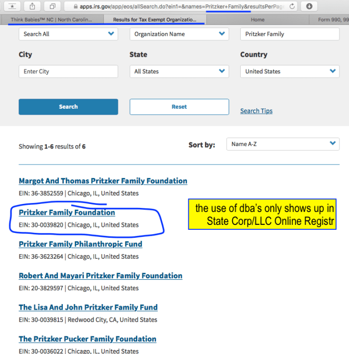 Many of My Sidebar Widgets, Some Mostly Text, Others Mostly Links, Now Live Here [Published July 9, 2019]. » Finding JB&MKPritzkerFamilyFnd’n not knowing it was an (expired) dba || IRS ‘Pritzker Family’ showed 6 results (EIN#300039820 wins the contest) ||Screen Shot 2019-07-07 at 5.41.42 PM