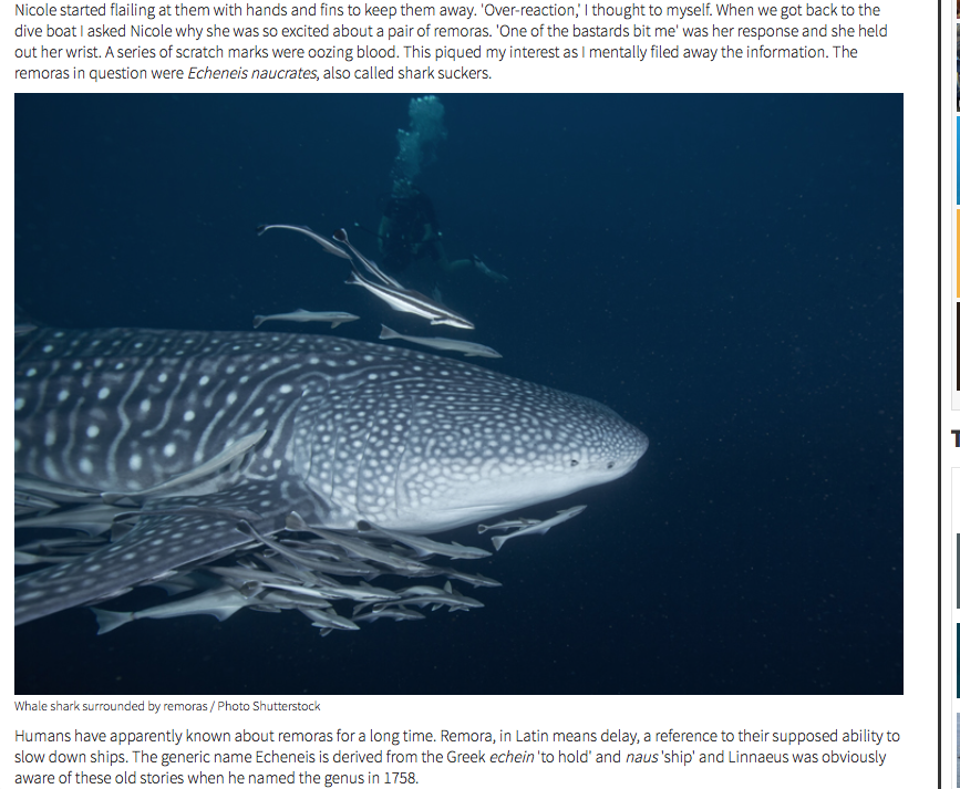 The Horrible natural History of Remoras by Paddy Ryan (undated) in “Dive” magazine. [Image 2 of 2, Whale shark with remoras — beneficial or parasitic?[they eat fecal matter, but too many creates “drag”]