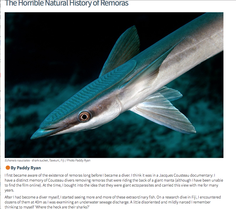 The Horrible natural History of Remoras by Paddy Ryan (undated) in “Dive” magazine. [Image 1 of 2, close up of a whale sucker showing specialized (suction) cap, developed it’s said from dorsal fin (of the remora)]