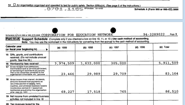 It was organized in 1997 (says the tax return) and its main revenues are not from government contributions, but from “program service revenues” — however these are labeled “membership fees/dues” which would in essence be contributions — and generally coming from educational (public) institutions, which (say the tax return, and CENIC’s schedule of revenues and assets over time) they only increase year after year. Looking at the details of the tax returns helps show where the weight of expenses and revenues is, and related entities, whether taxable or not. Here, one of the largest expenses for CENIC is “Circuit Leases” ($20M/year one year), while its two kinds of activities, one made a significant profit (nearly $12M — roughly) and the other, a loss. The profit comes from the membership dues.