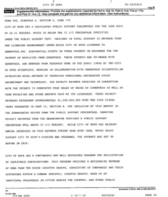 Click to enlarge! From the FY2014 IRS Form 990, an explanation why their royalties revenue is so high, and where Genetech fits in. EIN# 953435919.