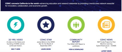 CENIC page, partial (click image to access) with brief activities statement and invitation to choose from a four-item menu of other promotional downloads. Icons prevail over labeling (“pictures vs. print”) verbiage minimal; readers must pick from only four doors if their category isn’t immediately reflected in titles, and whether or not desired info is found, will be sold on the products and services.