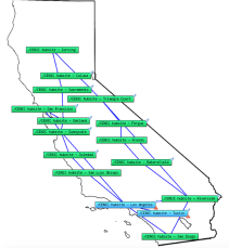 CENIC Network overview (@2019July2). If the map looks unfamiliar (see state outlines), it may because California here is horizontal; in an upright (N/S) alignment it covers a good deal of the USA’s Pacific Coast. Guess it fit the blog page better horizontally! (Notice San Francisco left, Los Angeles, San Diego further right).//LGH
