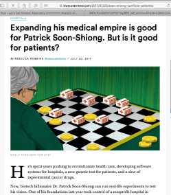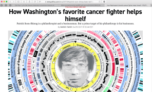 “How Washington’s favorite cancer fighter helps himself :Patrick Soon-Shiong is a philanthropist and a businessman. But a prime target of his philanthropy is his businesses.” 4/19/2017. Great graphic (appropriate, and it moves).