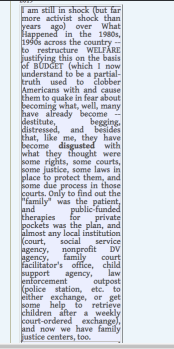 | I am still in shock (but far more activist shock than years ago) over What Happened in the 1980s, 1990s across the country — to restructure WELFARE justifying this on the basis of BUDGET (which I now understand to be a partial-truth used to clobber Americans with and cause them to quake in fear about becoming what, well, many have already become — destitute, begging, distressed, and besides that, like me, they have become disgusted with what they thought were some rights, some courts, some justice, some laws in place to protect them, and some due process in those courts.