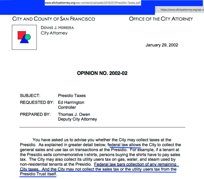 City and County of SF Opinion NO. 2002-02 on Praesidio Taxes (cites “the Buck Act”). Coherent explanation. “ReadMe” quality.