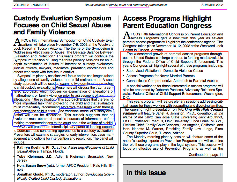 58 More Essays (Pages) on Essentials** of the Family Court Arena. **IMHO, as expressed 2009-2019. » AFCC ‘KIDS COUNT ON’ US Newsltr SUMMER 2002 Vol21No3~Feature CustodyEvalSymposium on CSA + FV (pg1 LH) + its ‘5th internat’l Congress (sic) on Access & Parent Ed~ SeeAlso the pdf ~ 6 imgs 2019July27 Sat PST@ 11.17.41 AM
