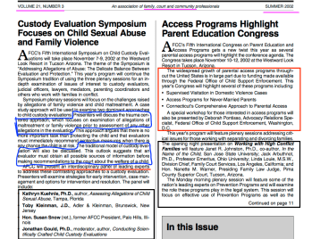 This is a pdf of the whole newsletter without annotation. Click on the blank page icon to open if the first click doesn’t do it (I’ve found this necessary on the blog). AFCC ‘KIDS COUNT ON’ US Newsltr Summer2002 Vol21No3~CustodyEvalSymposium on CSA+FV (pg1 LH) + AFCC’s ‘5th internat’l Congress (sic) on Access & Parent Ed~ ~SeeAlso 6 imgs 2019July27 Sat (The long title is just my filename).