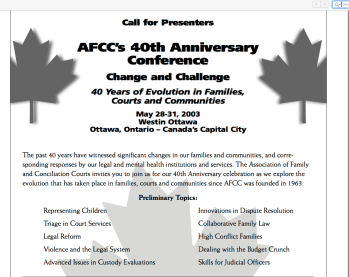 - 2003 conference in Ontario. Look at the subject matter. Gee, I missed that one (didn’t know about AFCC at this time, as a California parent with a DV protective order I was trying desperately to keep in place so I might continue working, as a single mother, safely.