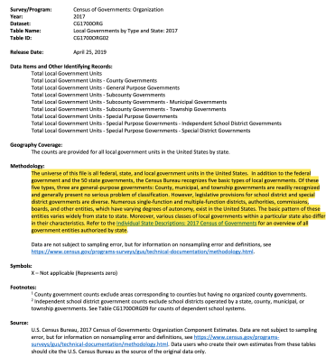 A U.S. Census publication, highlit portion describes types of gov’t counted. Good to be aware of..Also notice Footnotes 1 re: areas corresponding to counties (but without county governments) & 2 re: school districts, Independent vs.dependent (dependent district counts not included…).
