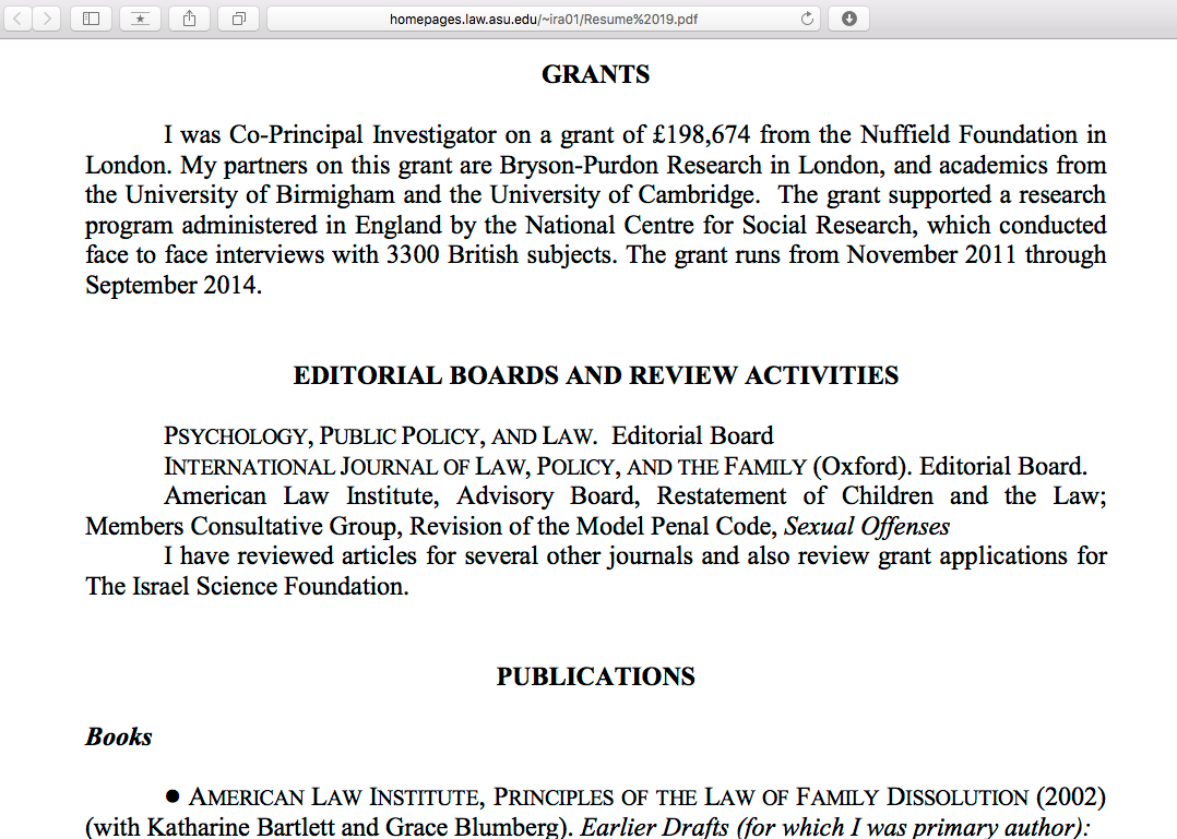 Prof Ira Mark Ellman C.V. (heading + top ‘GRANTS’ (only 1 shown) Prof Ira Mark Ellman (AZ State U) CV 2019, pg1 and ref to Nuffield Grant