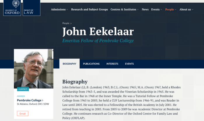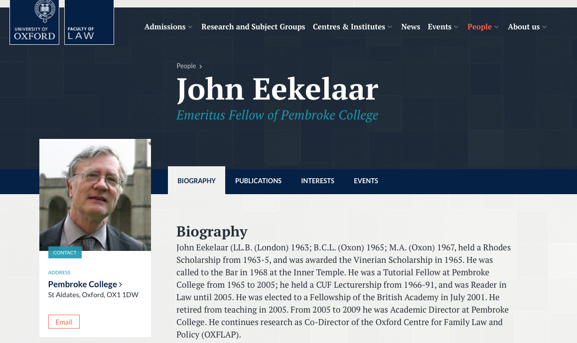 John Eekelaar biography (incl. degrees and work history: NB Rhodes Scholar (NS here, born S. Africa)