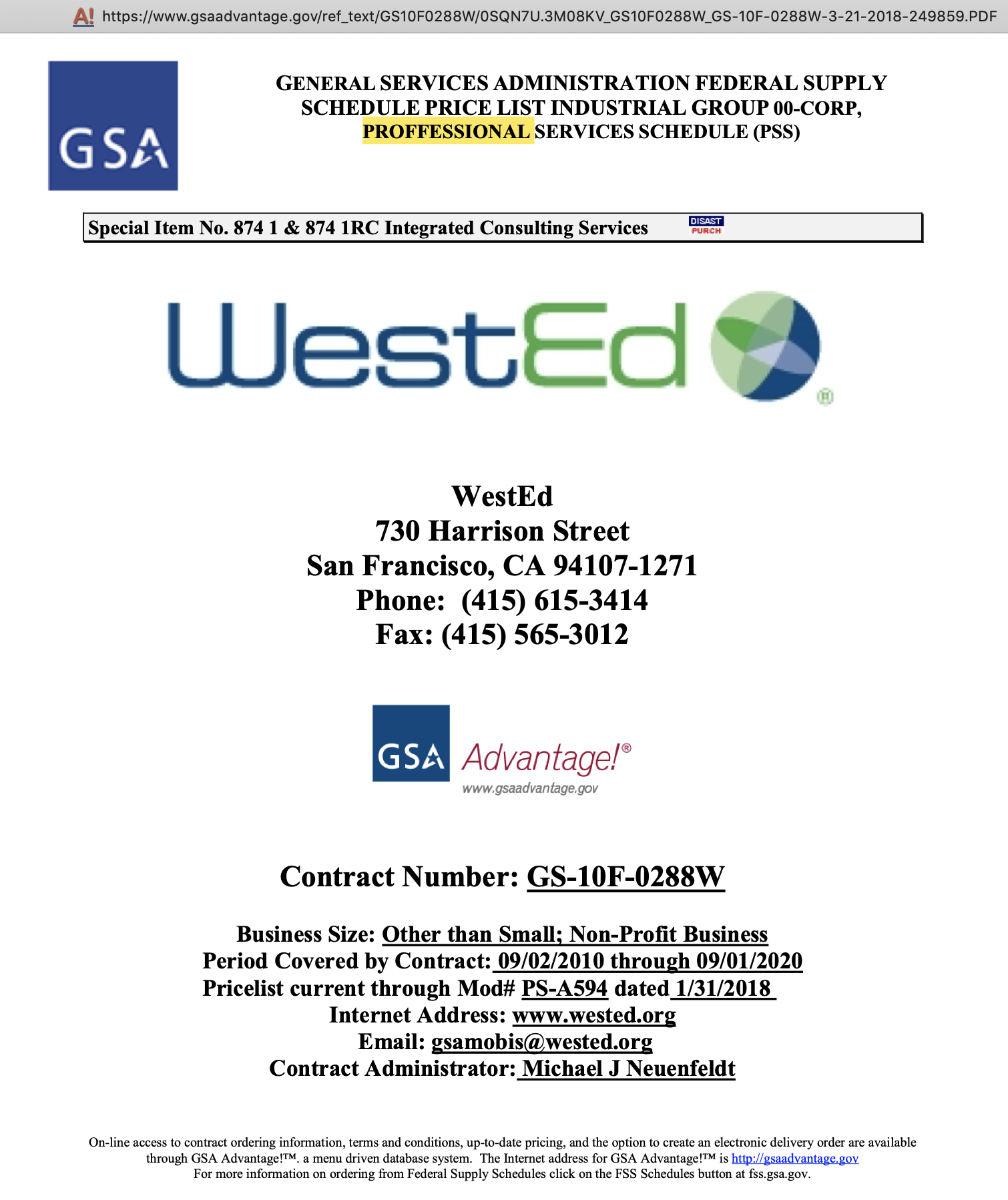 Shows WestEd as a federal contractors, specific contract lasting through 9/2020 gives more details on who or what WestEd Is.(Title Page, Image #1 of 2)
