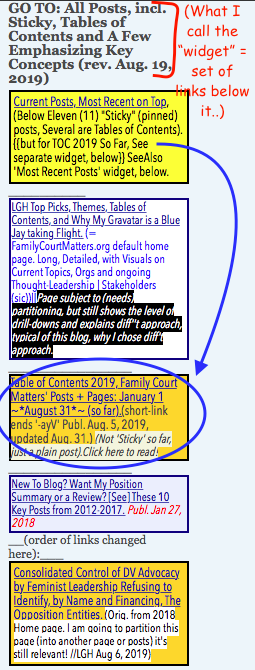 Table of Contents 2019, FamilyCourtMatters.org’s Posts + Pages: January 1 – Dec. 31(complete list). » LGH|FCM RightTop Sidebar GO TO Widget + (closeup) 2019TOC (updated~~>) Screen Shot 2019-08-31 at 9.57.11 AM