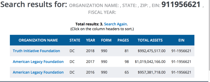 Truth Initiative Forms 990 (Last 3 @ August 7, 2019. NB Fiscal Year ends in June, so the “2018” shown is actually FY2017’s return (etc.)