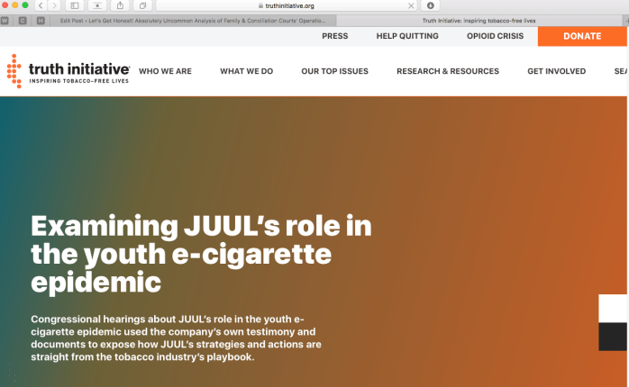 TruthInitiative.org website (top) (see window frame with URL) viewed Aug. 7, 2019. Far margin didn’t fit in…