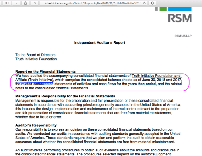 What’s happening to the Tobacco MSA Billions? From American Legacy Foundation (2002 Form 990 for EIN #911956621) to ‘Truth Initiative Foundation’ (Same Entity, New Name), Audited Financial Statements Promised but Not Produced (Publ. Aug. 14, 2019). » ‘Truth Initiative Foundation and Affiliate’ Audited Consolidated FS FYE2018,2017 Consolidated (YEJun30| my 1st look at ’em) ~~28 images (seeAlso pdf), 2019Aug15 PST @1.38.25 PM