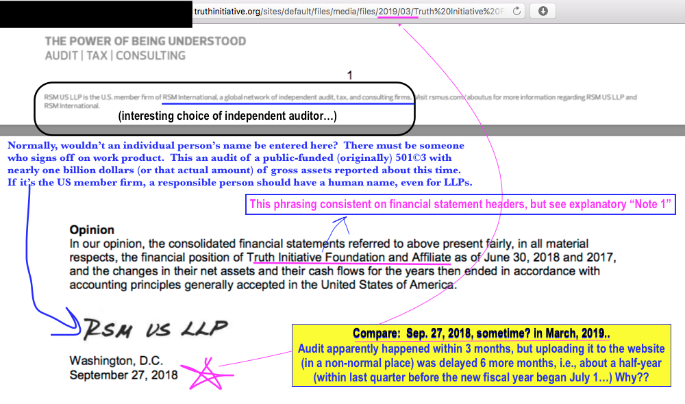 What’s happening to the Tobacco MSA Billions? From American Legacy Foundation (2002 Form 990 for EIN #911956621) to ‘Truth Initiative Foundation’ (Same Entity, New Name), Audited Financial Statements Promised but Not Produced (Publ. Aug. 14, 2019). » ‘Truth Initiative Foundation and Affiliate’ Audited Consolidated FS FYE2018,2017 Consolidated (YEJun30| my 1st look at ’em) ~~28 images (seeAlso pdf), 2019Aug15 PST @1.38.44 PM