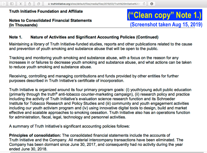 What’s happening to the Tobacco MSA Billions? From American Legacy Foundation (2002 Form 990 for EIN #911956621) to ‘Truth Initiative Foundation’ (Same Entity, New Name), Audited Financial Statements Promised but Not Produced (Publ. Aug. 14, 2019). » ‘Truth Initiative Foundation and Affiliate’ Audited Consolidated FS FYE2018,2017 Consolidated (YEJun30| my 1st look at ’em) ~~28 images (seeAlso pdf), 2019Aug15 PST @1.48.24 PM