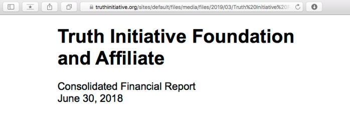 What’s happening to the Tobacco MSA Billions? From American Legacy Foundation (2002 Form 990 for EIN #911956621) to ‘Truth Initiative Foundation’ (Same Entity, New Name), Audited Financial Statements Promised but Not Produced (Publ. Aug. 14, 2019). » ‘Truth Initiative Foundation and Affiliate’ Audited Consolidated FS FYE2018,2017 Consolidated (YEJun30| my 1st look at ’em) ~~28 images (seeAlso pdf), 2019Aug15 PST @1.48.51 PM