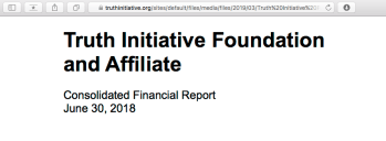 UPDATE Thu Aug. 15, 2019: In the usual “post-publication review,” I again tested the same ‘TruthIniative.org’ labeled link which had looped back to the start previously, and uploaded from the same place, its Audited Financial Statements FYE June 2018 (which is to say, for Fiscal Year 2017).