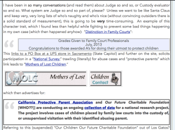 Also not handled here (in case you wonder why I may feel at times overwhelmed blogging this), I’ve seen on-line some of the same organization and individuals showing up here (whether in footnotes only and/or as signers to the Collective Memo of Concern to WHO) I’ve known, been exposed to the philosophies of and at times dealt personally with (and who also know about my blog and a few others SOMEwhat similar, before me, though I don’t think they continued so long or went so far) I’ve seen submitting documents and quoting each other on task forces of pending (last I looked) legislative changes to family court proceedings — or law — in both Maryland and Pennsylvania.