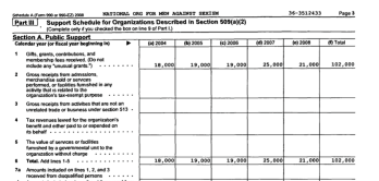 Looking now in August 2019 at the IRS, under its EIN# 363512433 (shown below), there is no record of a Form 990-N (electronic post-card) filing, however there is a FY2017 (YE Dec., and although this is now ¾ of the way through 2019, nothing for 2018 shows up yet for NOMAS). it has only one director listed, reports $29K rec’d (on page 1, but its “Schedule A of Support” showing the past five years, including “2017,” shows only $21K rec’d five years ago.