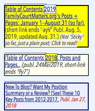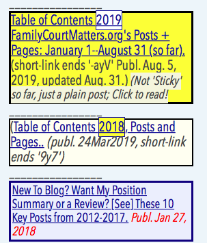 The Dangers of Derailment from “First Things First!” in Family (and Conciliation) Court Reforms to Save Children from Violent Parents (and/or Prevent Violence Against Women) (+/- Aug. 20, 2019) » LGH|FCM GO TO Widget w| TOC 2019 & 2018 display (boxes|links) fixed ~~SShot 2019Sept01 Sun PST @ 1.32.46 PM