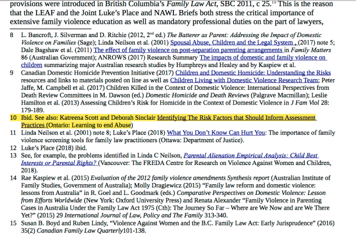 Brief on Bill C-78, an Act to Amend the Divorce Act, The Family Orders and Agreements Enforcement Assistance Act and the Garnishment, Attachment and Pension Diversion Act and to make consequential amendments to other Acts. … submitted by Dr. Linda C. Nielson (showing Footnotes 8 through 15. See yellow highlit portion on FN 10).//LGH Aug 20, 2019