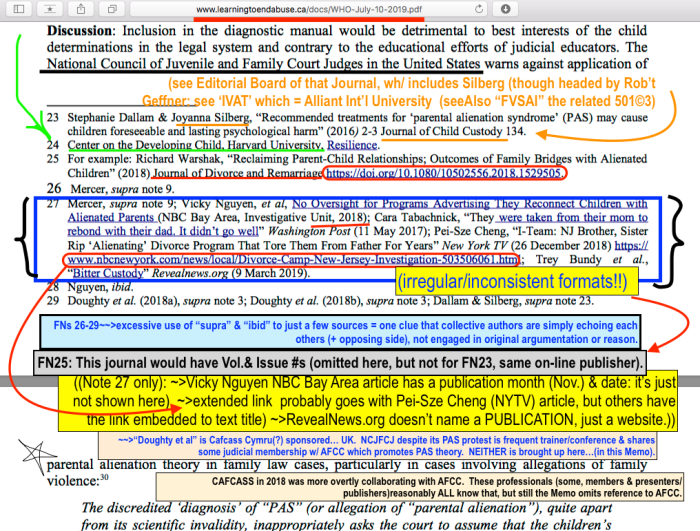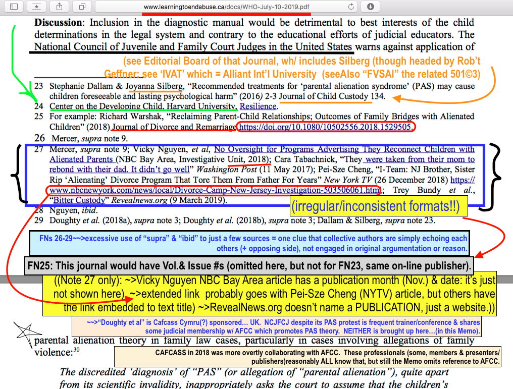 Lead-in text (NCJFCJ cited), FNs 23-29 to “Collective Memo of Concern about “Parental Alienation” to WHO (July 10, 2019)