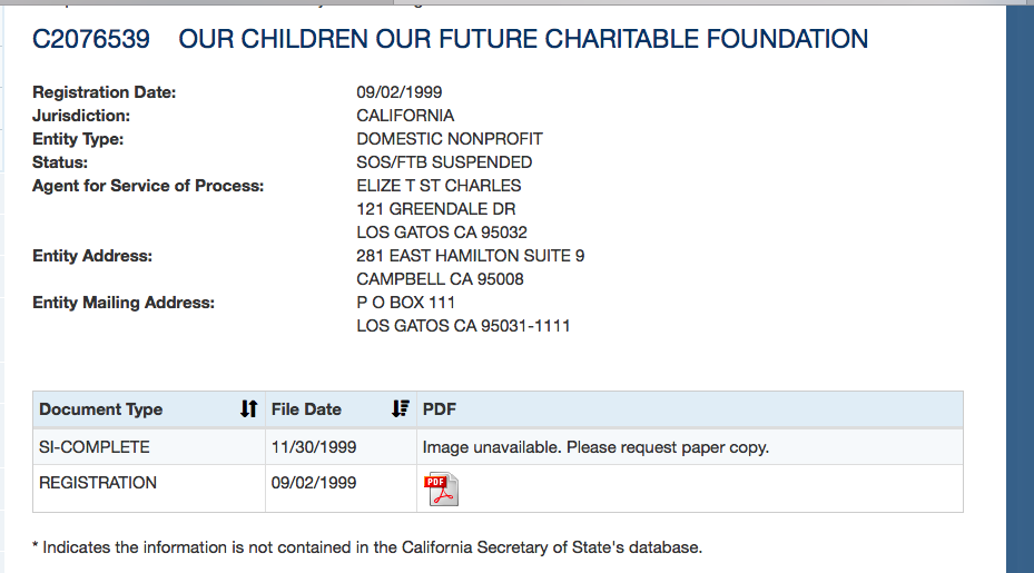 Our Children Our Future Charitable Foundation (Entity#C2076539) (Calif SOS Business Entity Search re-checked Aug. 2019) shows minimal registration, no annual renewals past 1999)