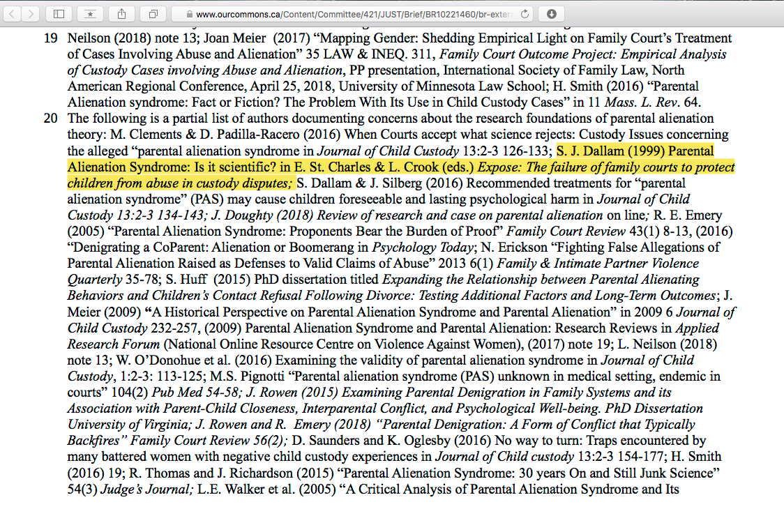 Footnote 20 from Brief on Bill C-78, an Act to Amend the Divorce Act, The Family Orders & Agreemts Enforcemt Assistance Act… submitted by Dr. Linda C. Nielson), with 1999 ‘Expose’ reference highlit: Author, eds., title and date shown — just not the publication itself. Publications happen in books, journals, or mainstream media. Omitting the “published by” is odd. Also look at the sequence of years quoted. Apparently this 1999 reference is meaningful to this author.
