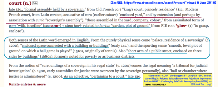 Etymonline.com defines court.Just pointing out origins of the word and how far back it goes “formal assembly of a sovereign,” and the sense of “enclosed” [For my post ending in shortlink ‘-9PC’ started May 29, 2019