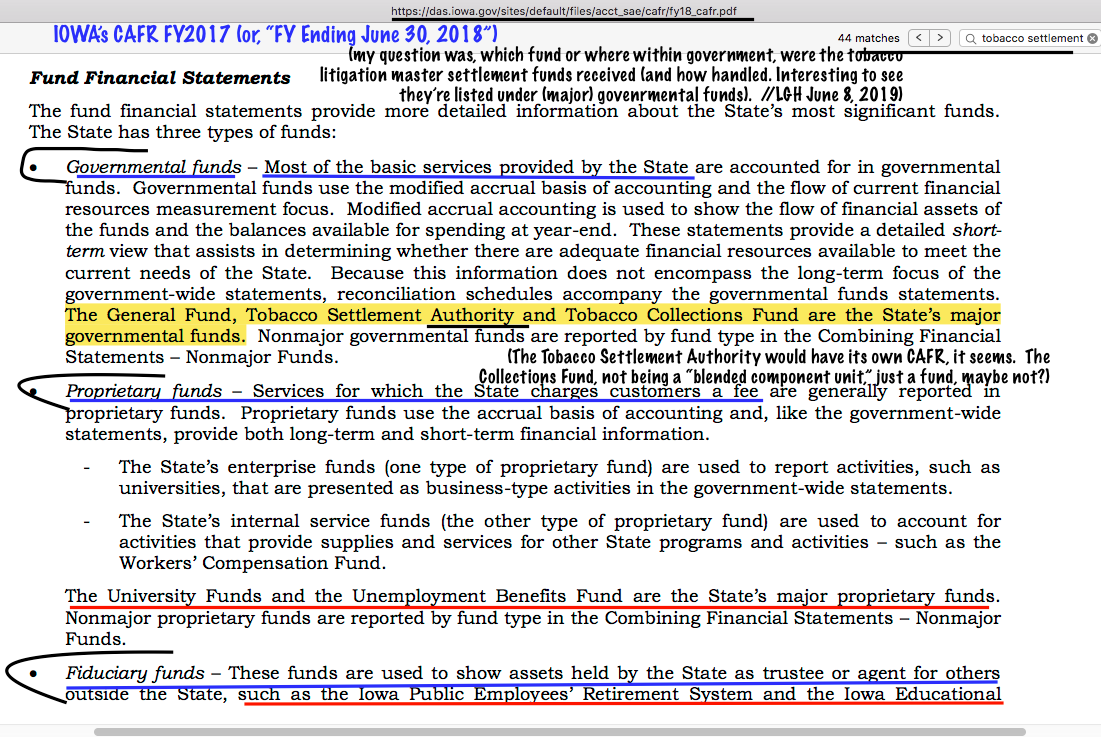 Reform, Solutions, Enhancements, Adjudication Improvements Built on WHAT? (Unproven Because Unspoken Assumptions about the Deliberate Design = the Deliberate Purposes of the Family Courts in the USA?) [Started May 2, 2019, Publ. Aug. 29]. » IOWA CAFR YEJune2018, re Tobacco Settlement Authority + Collections Fund (incl 1 news report of $49’5M rece’d in 2019) ~~Screen Shot 2019-06-08 at 3.22.27 PM