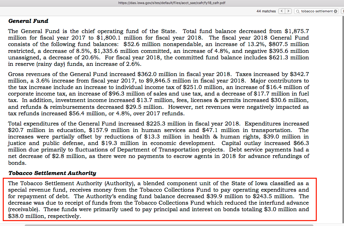 Reform, Solutions, Enhancements, Adjudication Improvements Built on WHAT? (Unproven Because Unspoken Assumptions about the Deliberate Design = the Deliberate Purposes of the Family Courts in the USA?) [Started May 2, 2019, Publ. Aug. 29]. » IOWA CAFR YEJune2018, re Tobacco Settlement Authority + Collections Fund (incl 1 news report of $49’5M rece’d in 2019) ~~Screen Shot 2019-06-08 at 3.24.56 PM