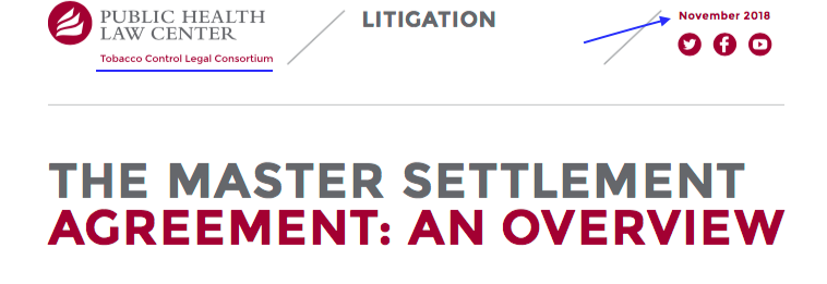 Public Health Law Center MSA Overview (15pp pdf with 69 Endnotes, sponsored with help from the Robert Wood Johnson Foundation. Dated Nov. 2018 (a few months later, the PHLC abandoned use of the name “Tobacco Control Legal Consortium,” which I’d called attention to a few yrs ago (2017) on this blog when it participated in an amicus brief as, I believed at the time, a non-entity. (I’m no lawyer, but that seemed off..)