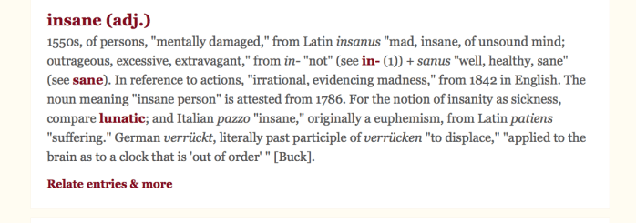 Online Etymology Dictionary (“http://etymonline.com”) set to “sane.” See also “insane” and related words. LGH May 2, 2019