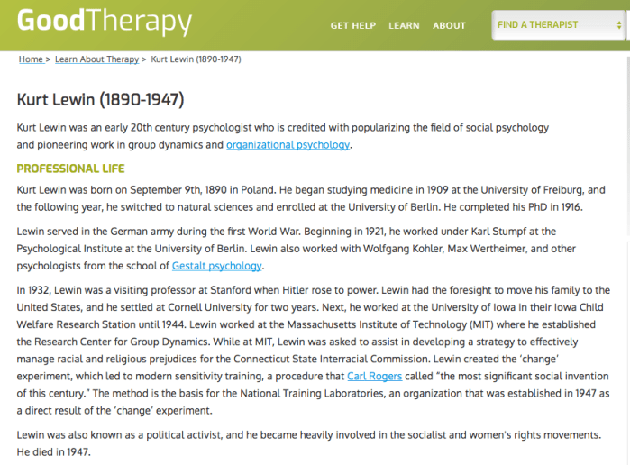 KURT LEWIN (2015), www’goodtherapy’org|famous-psychologists|kurt-lewin’html ~~Screen Shot 2019-08-18