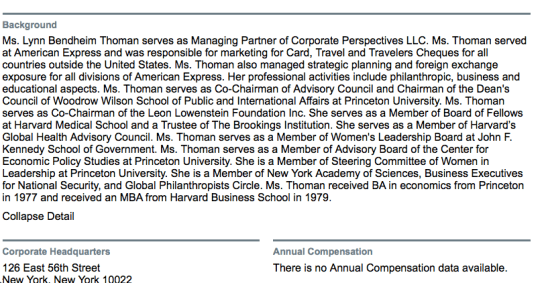 This executive snapshot is from Bloomberg.com (viewed 8-8-2017) click image to for link. I didn’t confirm this is the same person as on the Bendheim-Thoman Center for Child Well-Being at Princeton, but sounds like a reasonable assumption… [Leon Lowenstein Fndtn (EIN# 136015951) 990PFs table included in this 8/8/2017 post) (Website says establ. 1941, that they don’t take ANY unsolicited grant requests, and grantees only visible via a password. There’s a paragraph, a street address, a “contact us form, and that’s about it!) {{previously posted by me on FCM, Aug 19, 2017?}}