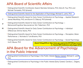 An APA website search-function, “Michael E. Lamb” kicked out 103 references, the first one referencing the above publication. Picking the second search result (because I’d already read the first one), “APA honors Psychology’s stars” (an August, 2015, APA conference in Toronto announcing awards), I found he had two: notice for which: