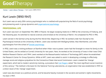 This is from GoodTherapy.net under “famous psychologists” on Kurt Lewin Biography I’m posting an image, but that’s not the whole page. The group dynamics, theory of change, and which universities were involved still matter: