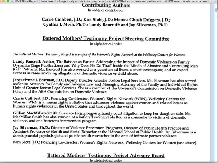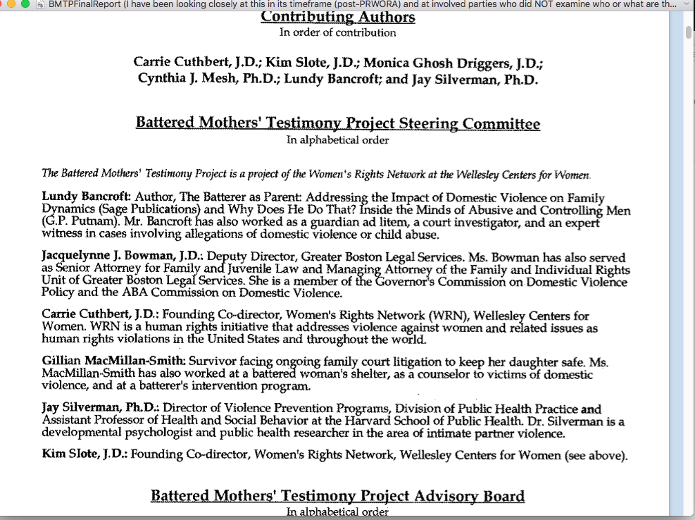 4A (top half of page: JD’s, a PhD (& co-author Lundy Bancroft, w/o either degree) but the one Survivor (no JD or PhD) listed here is NOT “Contributing Author” altho has both experiential and front-line service experience. Why?