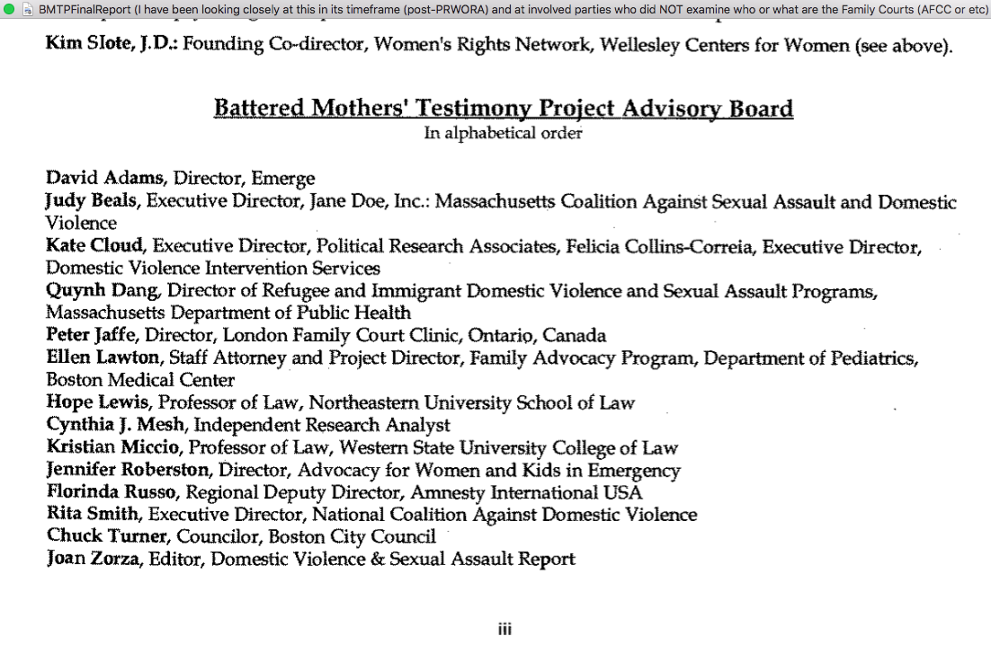 4B (bottom half of same page). NB: The composition of the Advisory Council and Committees often pre-determine outcomes & what info will NOT make it into the report, which then can be used as a basis for policy: David Adams, Peter Jaffe (Note: London Family Court Clinic in Ontario =/= gov’t but private nonprofit; also, he’s AFCC stalwart, Canadian), Joan Zorza (JD, from the professionalized DV field, Amnesty International, a director of ‘AWAKE,’ etc.