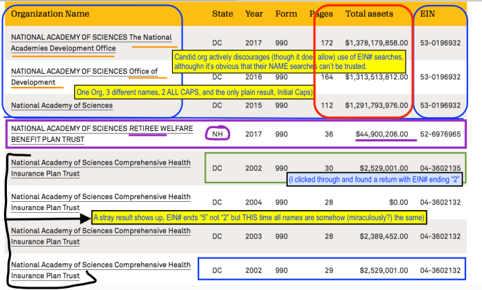Candid.org 990-finder database when I searched “National Academy of Sciences” comes up with the main one (wrongly named 2 out of 3 times) one wrong EIN# (attached to a tax return which doesn’t match) and exposes a strangely short-lived (I looked) tax-exempt, only about 2002-2005, main purpose apparently selling certain holdings at a loss, and that the DC-based organizations Retiree plan has a NH address for some reason…//LGH Oct 16, 2019