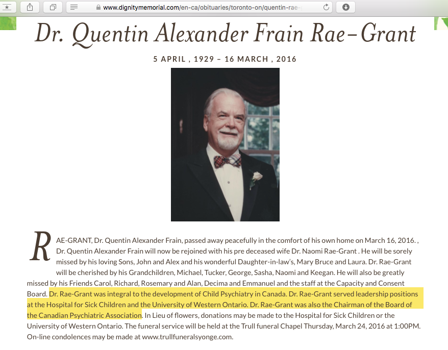 Dr. Quentin Alexander Frain Rae-Grant (1929-2016) “integral to the development of Child Psychiatry in Canada.” [Context: History of LFCC.ON.CA (original funding was ℅ his wife, Dr. Norma Rae-Grant w/ connections at the time to the Ministry of Health, it says. Viewed Oct. 2019