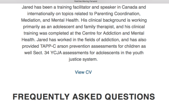 In just 5 pages, “AFCC”shows up 6 times (incl. as “AFCC-O” or “AFCCO”), written out 8 times “parenting coordination” (featured) 4 times and “high conflict” 13 times). It seems indeed possible to have a post-graduate lifetime healthy employment (1984-2017, that’s about 33 years) primarily working the AFCC circles of career paths and citing its trainings all along the way… If you want a look at what “next generation” mentored by AFCC-drenched professionals, look at Jared Norton (MSW 2010)’s cv from FamiliesMovingForward. His career had more variety BEFORE he got the MSW! Involved w/ Barbara Jo Fidler since 2010-2011. Jared Norton lists involvement in Office of the Children’s Lawyer. In addition, Shely Polak is both AFCC -O board and Families Moving Forward Board. Also “Office of the Children’s Lawyer” involved is another board member, AFCC-O (but not Families Moving Forward) Board Member Archana Medhekar LinkedIn):