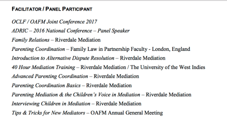 (By the way, who or what is “Riverdale Mediation,” what was it doing in the West Indies (nice place to have a training?) and where was the one c.v. reference to presentation “Parenting Coordination – Family Law in Partnership Faculty – London, England,” that is, who hosted, convened and/or sponsored it?)