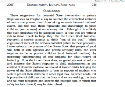 2003 Joan Meier (GWU law) DV, Child Custody, Child Protectn UNDERSTANDING JUDICIAL RESISTANCE (blog this, endorses Greenbk, NCJFCJ, quotes AFCC, ignores PRWORA!) [Conclusion]~~Viewed 2018Apr26 [Image reposted10/26/2019, shortlink ending “-asn”]
