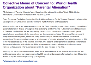 - Page 1 of pdf uploaded to CREVAWC (London, Ontario, Canada) Lead-in text (NCJFCJ cited), FNs 23-29 to “Collective Memo of Concern about “Parental Alienation” to WHO (July 10, 2019).” Footnote 27 references ‘Mercer, supra note 9’ and a string of media articles from 2018 and 2019, most re: reunification camps and programming (Vicky Nguyen et al., Trey Bundy et al., Cara Tabachnick, and Pei-Sze Cheng (Also NBC) (Clean copy. See nearby heavily annotated one! //LGH 2019Aug23